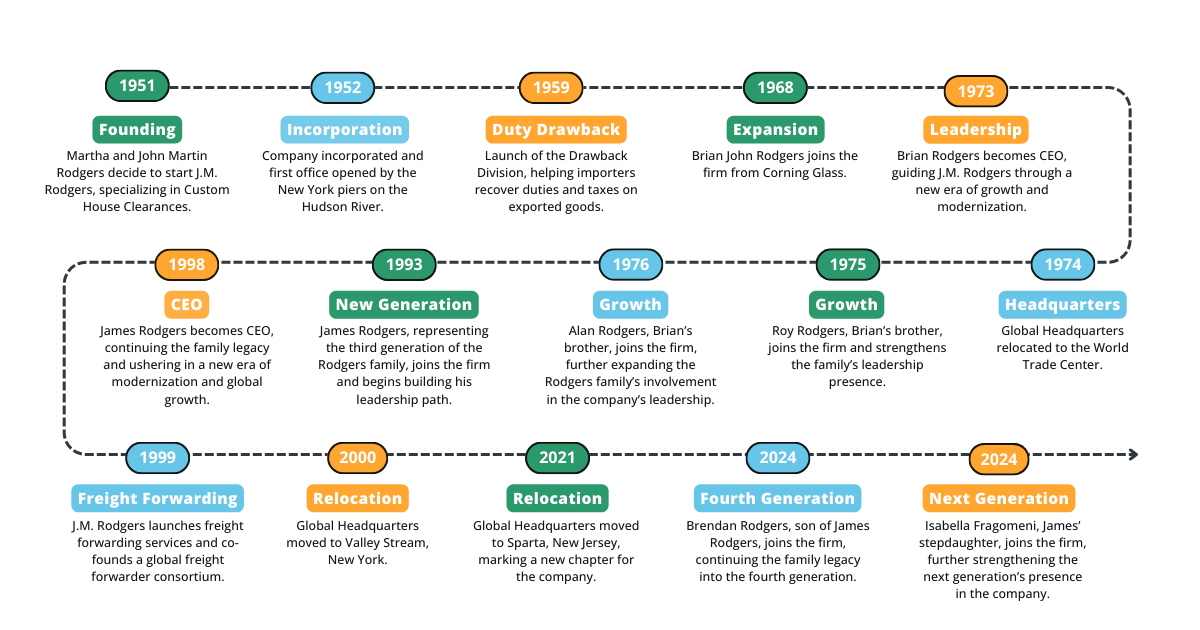 J.M. Rodgers Co., Inc. is a proud, family-owned and operated business that has been a cornerstone in the customs brokerage, duty drawback, and logistics industries for more than 73 years. Founded in 1951 by John Martin and Martha Rodgers, our company has grown from a small, entrepreneurial venture at the New York piers into a nationally recognized leader in global trade services.
